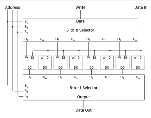 - 구조 상으로는 8×1 RAM의 경우 3-to-8 decoder와 8-bit-Latch, 8-to-1 selector로 구성되어 있습니다.