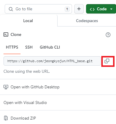> code를 누르고 repository 주소를 복사합니다.