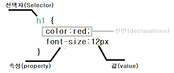 3. 선언 : 속성과 값으로 이루어진쌍, 끝날때마다 세미콜론( ; )을 붙인다.