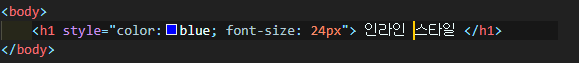 <h1 style="color:blue; font-size: 24px"> 인라인 스타일 </h1>