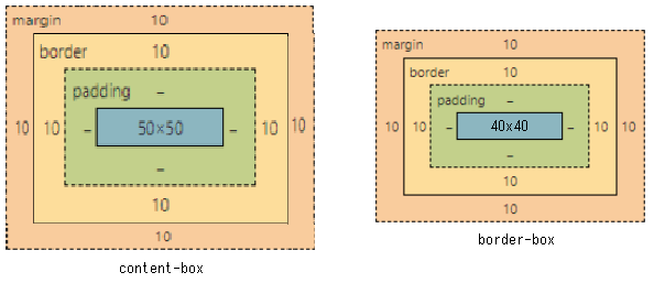 - CSS 표준이 정의한 초기 기본값으로, 속성이 콘텐츠 영역만 포함하고 안팎여백과 테두리는 포함하지 않습니다.