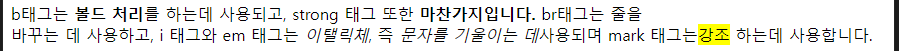 - b, strong : bold체, 사용하면 태그 내 텍스트는 굵게 표시된다.