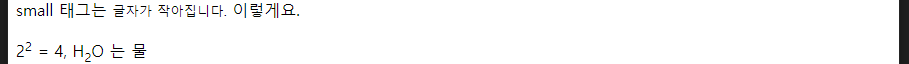 - small : 작은 글씨, 맨 아래 주석이나 저작권 표시등에 사용되며, 글씨가 작게 나온다.