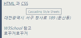 - abbr : abbreviation, 약자, 또는 생략어, 태그 내에 축약어를 적는데 사용하며,